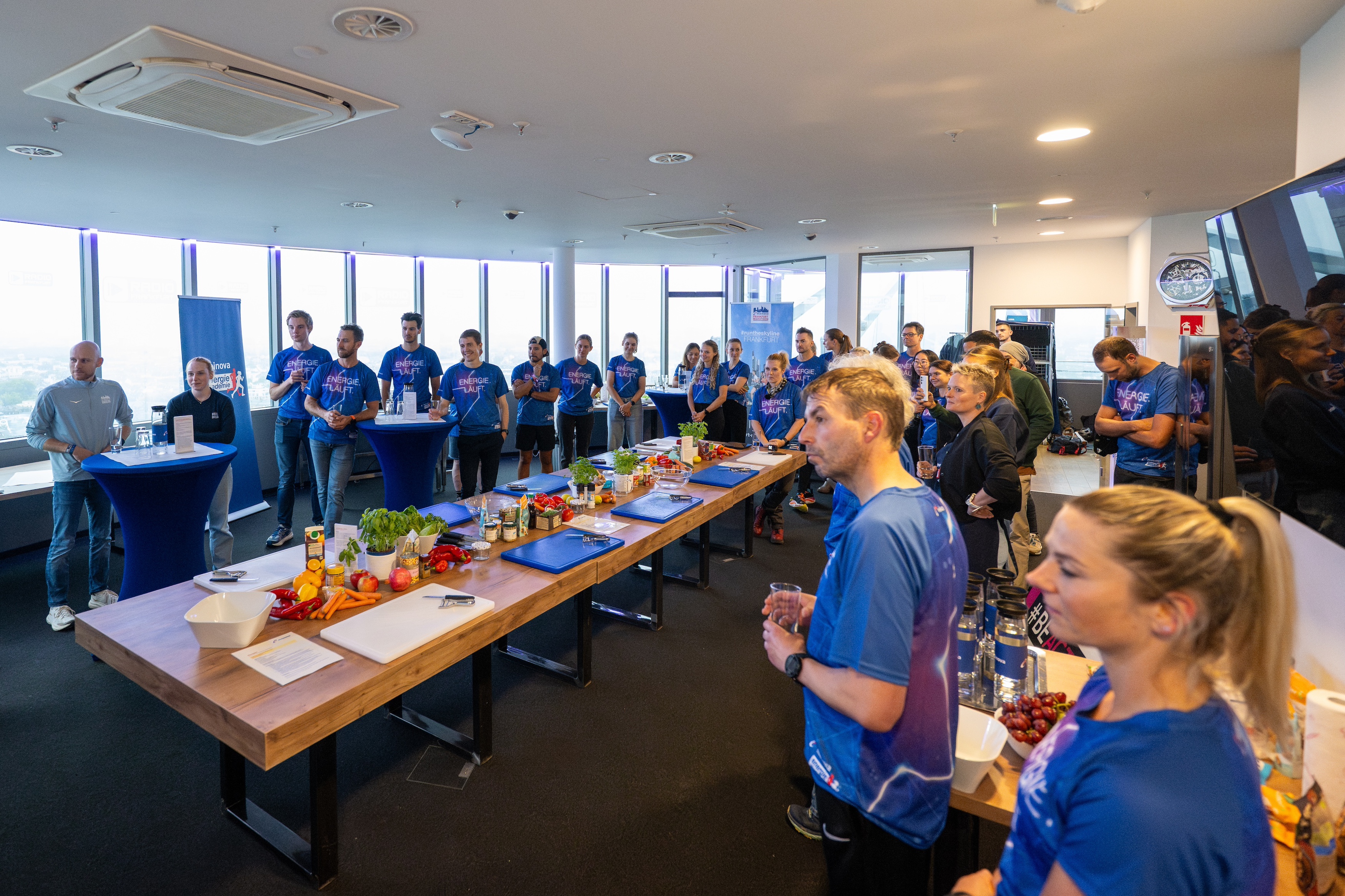 Nach dem Lauf wurden die Radio Frankfurt Skyline Studios zur Bühne für ein interaktives Kochevent mit den Ernährungsexpertinnen Anna Lena van der Felden (Eintracht Frankfurt) und Annika Twele (Deutsches Institut für Sporternährung e.V.). Die Teilnehmenden erhielten praxisnahe Tipps für eine ausgewogene, energiereiche Ernährung speziell für den Ausdauersport. Mit einfachen, alltagstauglichen Rezepten konnten die Gäste direkt ausprobieren, wie gesunde Ernährung Training und Regeneration optimal unterstützt – immer mit atemberaubendem Blick auf die Frankfurter Skyline und Teile der Marathonstrecke.